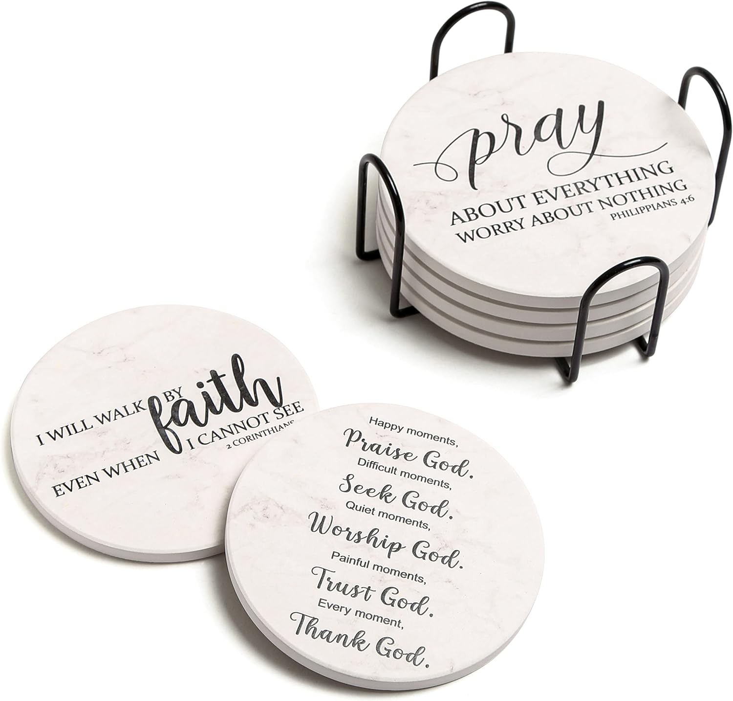 Protect your tables and surfaces while sharing inspirational messages with our Coasters for Drinks with Bible Verses. This set of six absorbent ceramic coasters features uplifting Bible verses, making them perfect for both practical use and as a beautiful addition to your home décor. Ideal for Christian gifts, these coasters come with a convenient holder for easy storage.